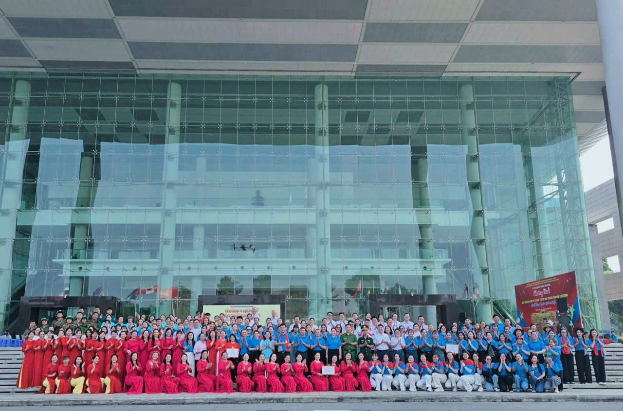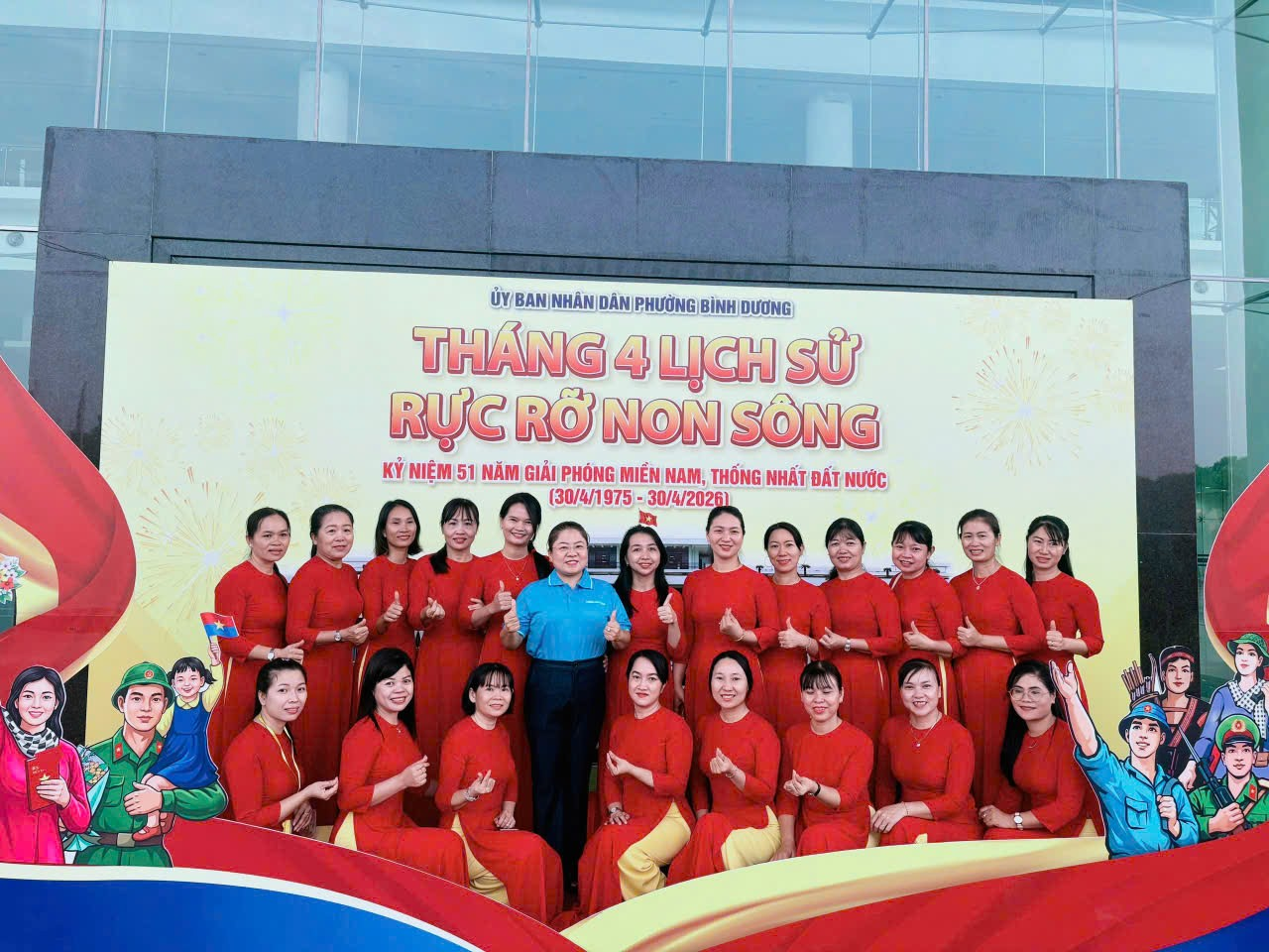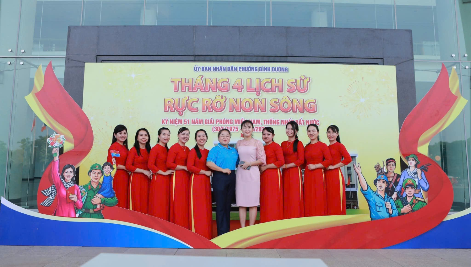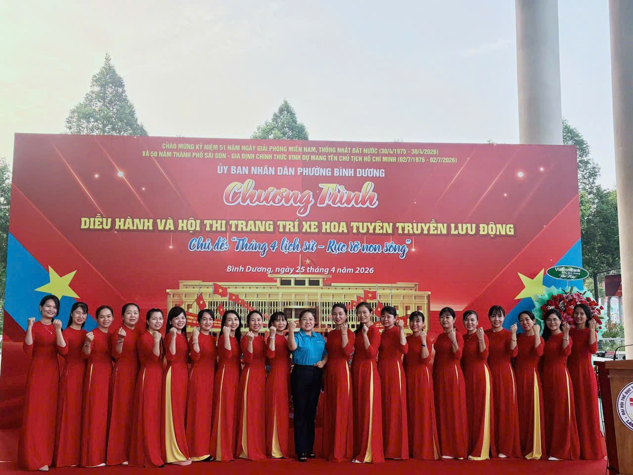 Trên tay mỗi thành viên, những lá cờ đỏ sao vàng tung bay phấp phới trước gió, hòa cùng tiếng nhạc hào hùng. Sự kết hợp giữa nét truyền thống của áo dài và vẻ rực rỡ của màu cờ sắc áo đã tạo nên một khung cảnh tràn đầy sức sống, thể hiện sự tiếp nối thế hệ và lòng tri ân sâu sắc đến cha ông đi trước.