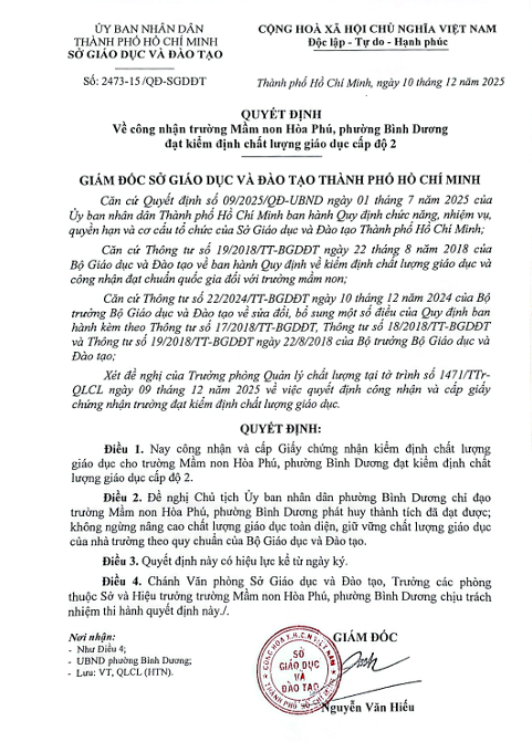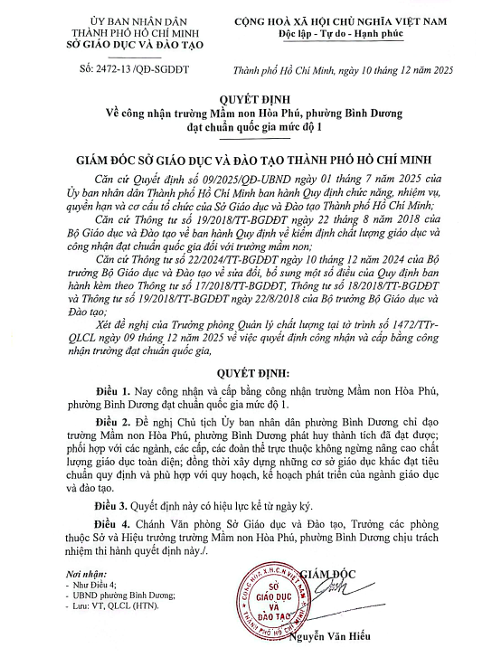 Trường Mầm non Hòa Phú chính thức được Sở Giáo dục và Đào tạo Thành phố Hồ Chí Minh công nhận đạt Chuẩn quốc gia Mức độ 1 và Kiểm định chất lượng giáo dục Cấp độ 2. Đây là cột mốc quan trọng khẳng định vị thế và nỗ lực không ngừng nghỉ của tập thể sư phạm nhà trường trong sự nghiệp "trồng người".